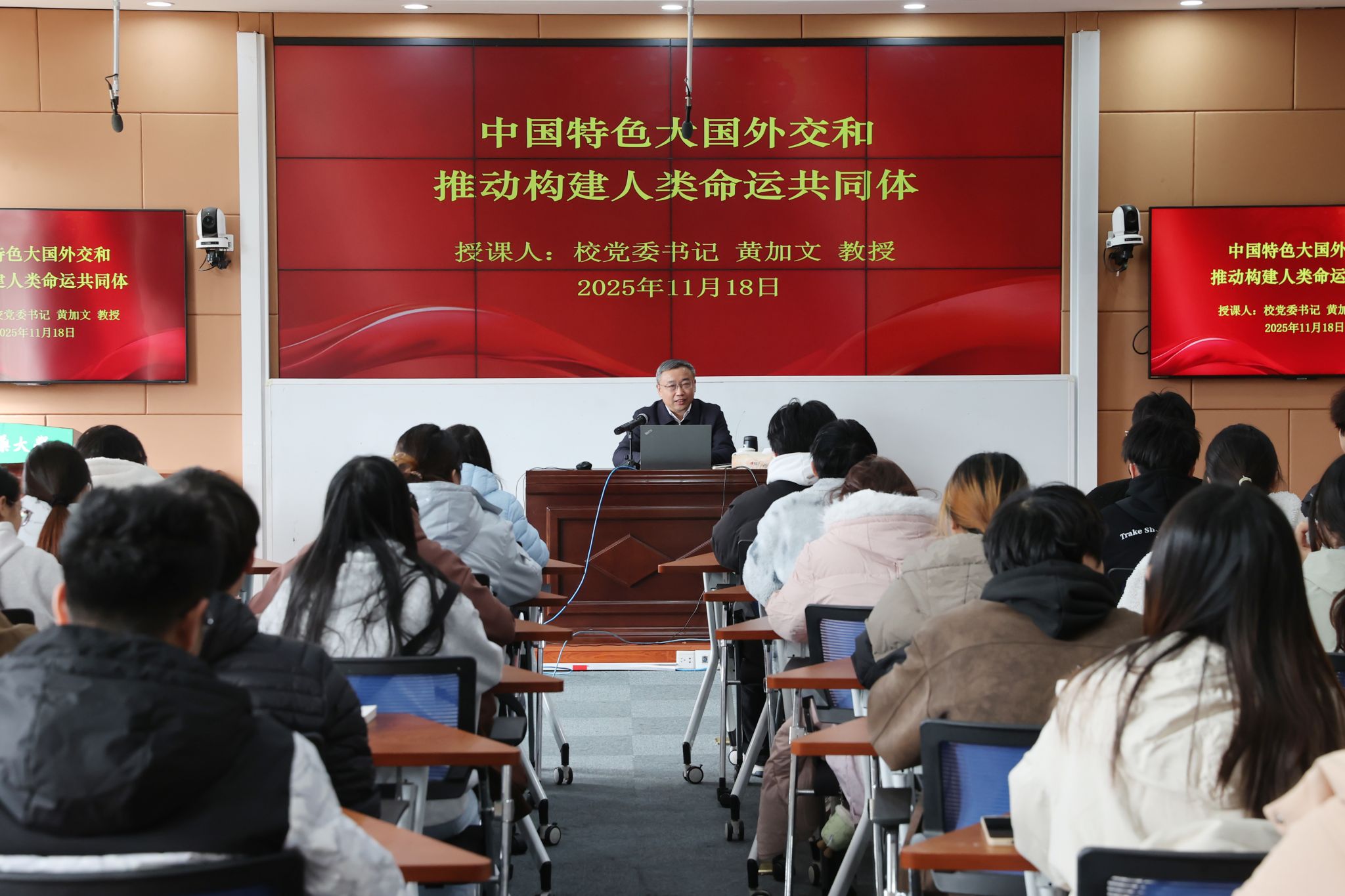 课程紧扣《习近平新时代中国特色社会主义思想概论》核心内容,黄加文结合自身工作经历与近期国际时事,从习近平外交思想“十个坚持”核心要义切入,系统解读当今世界发展大势与时代潮流。通过详实数据与鲜活案例,阐释了全球进入新动荡变革期的表征,分析了国际力量对比深刻变化与经济全球化逆流等时代课题,深入解读构建人类命运共同体的科学内涵。通过分享中国在国际合作、全球治理、多边外交等方面的具体实践,元首外交引领潮流、“四大全球倡议”落地生根、“一带一路”高质量发展等外交发展成果,展现中国作为负责任大国的担当。